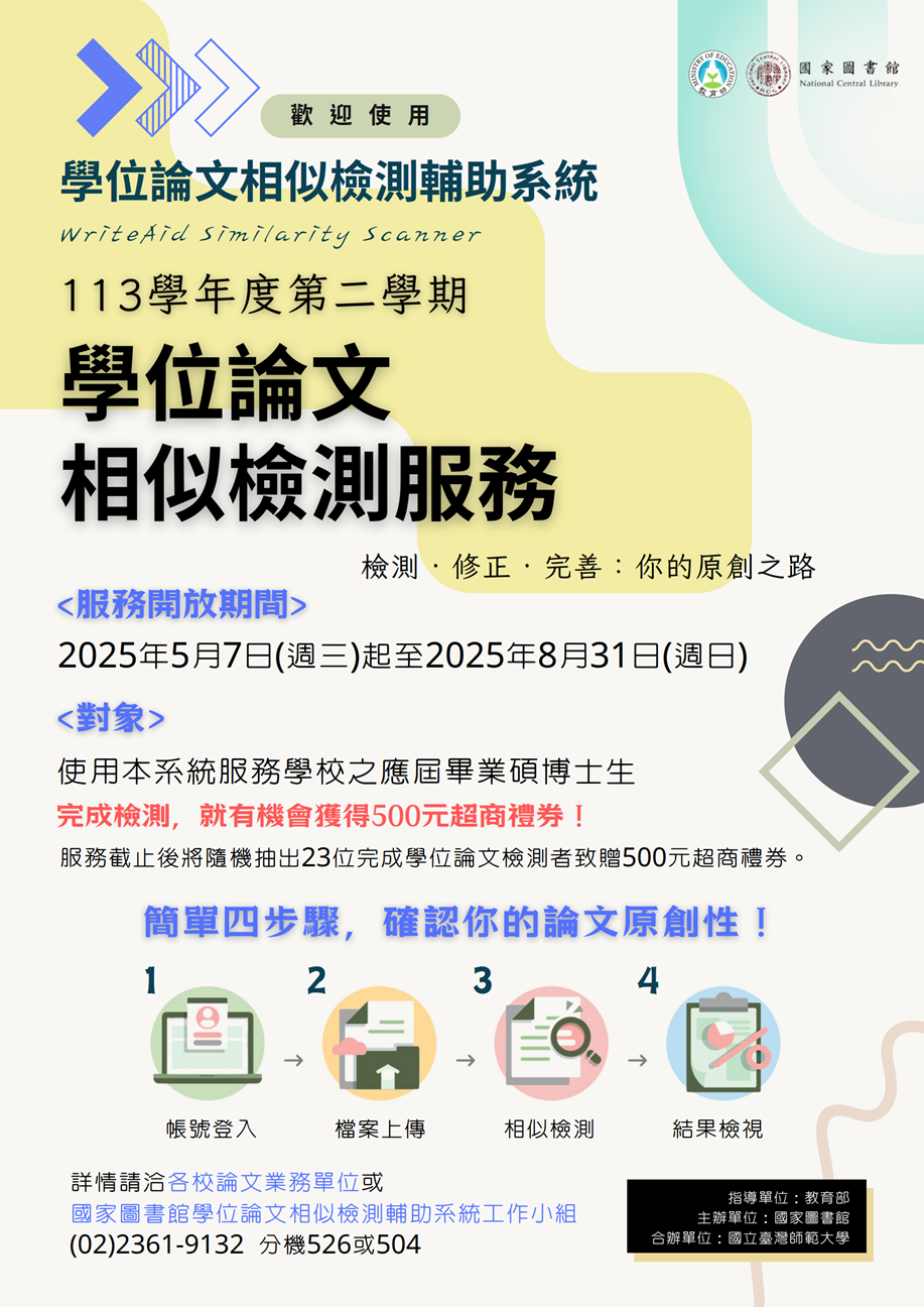 113-2學期國家圖書館「學位論文相似檢測輔助系統」試用抽獎活動