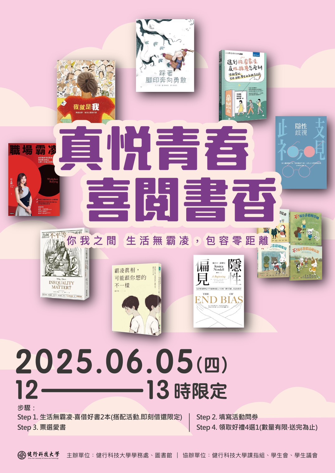活動期間,於行政大樓展出相關圖書之外,並於114年6月5日當天推出"用借閱好書支持平等"。 藉由:1.借好書;2.票選愛書等一連串的步驟,認識這個議題中的指標性圖書。活動當天,共計有68人參與本項活動。