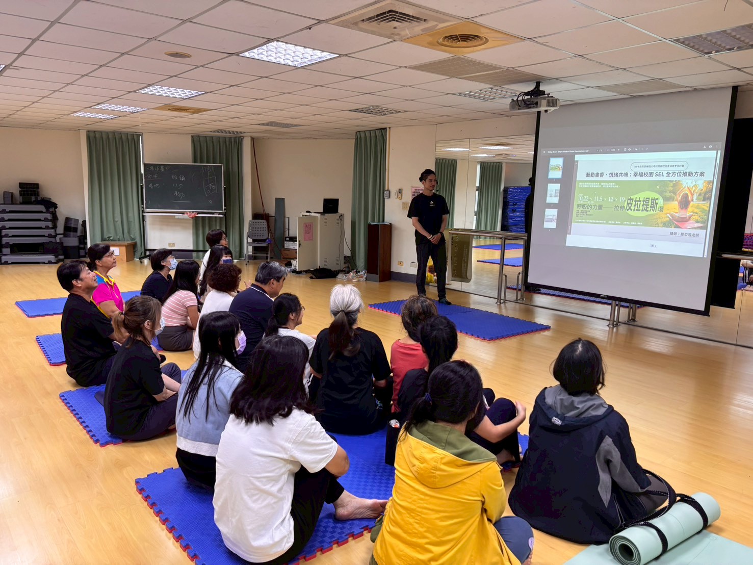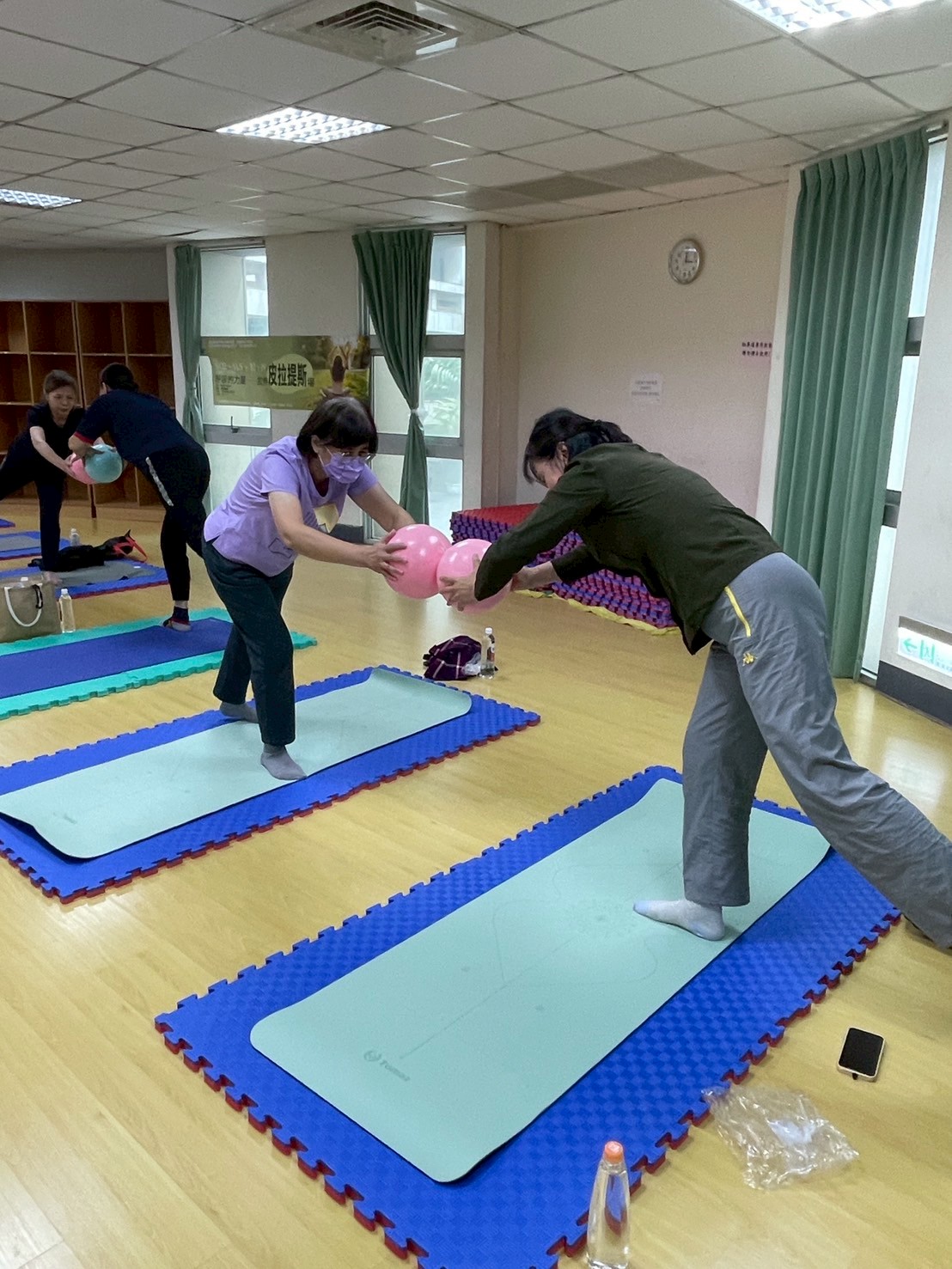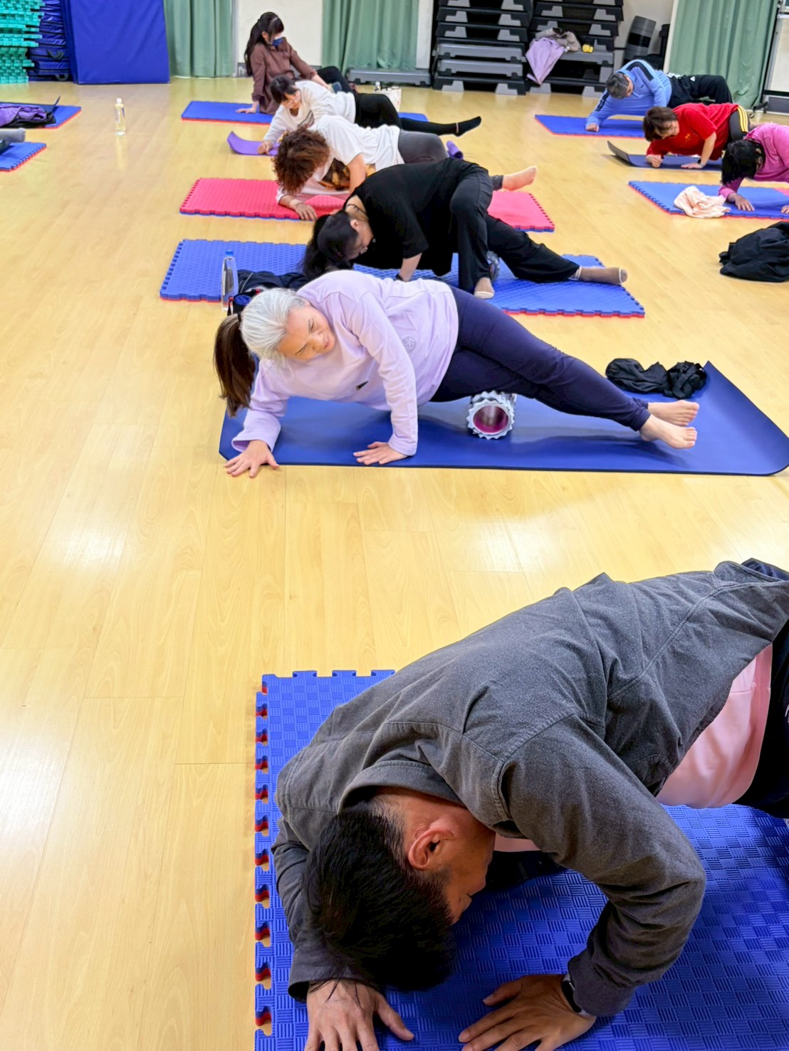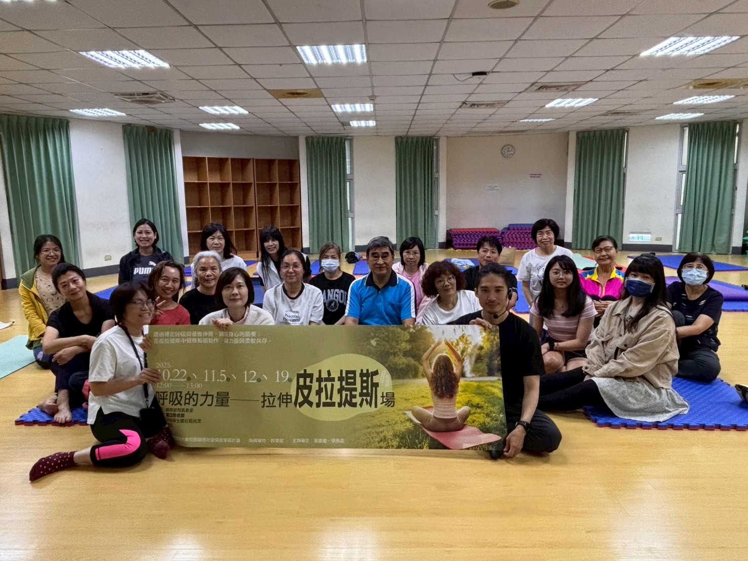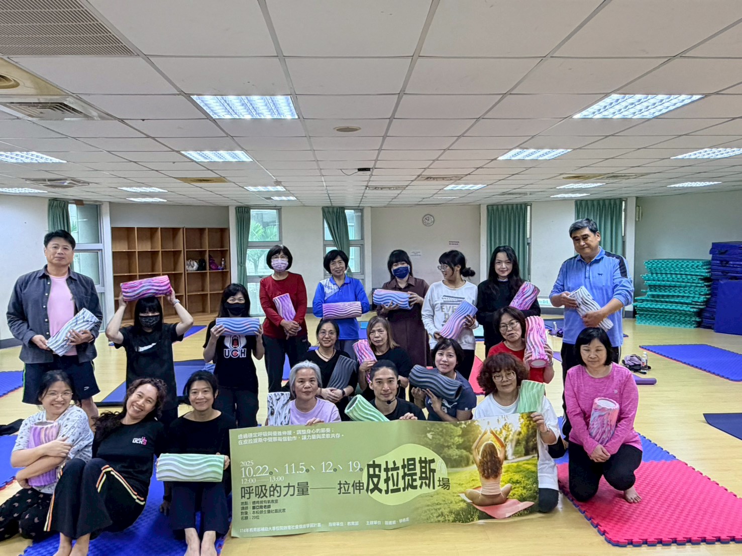 於114年10月22日以及11月5日、12日、19日舉行,共計100人次參與。分別利用了:彈力球、彈力帶、瑜珈圈以及滾輪按摩筒讓學員體驗有器材輔助對身體的助益,並且利用2人一組的模式讓原本安靜的皮拉提斯有了更多的學員互動。