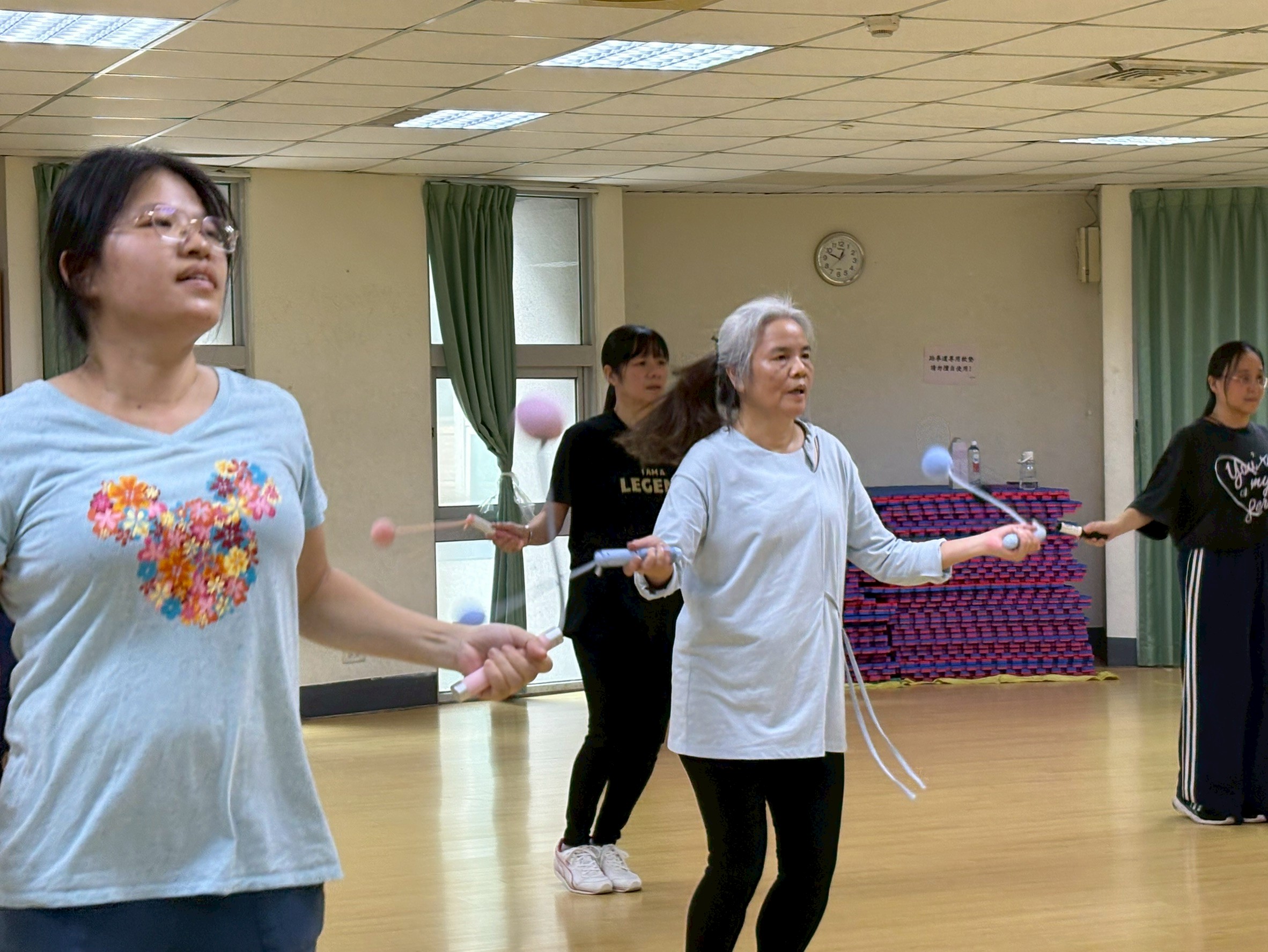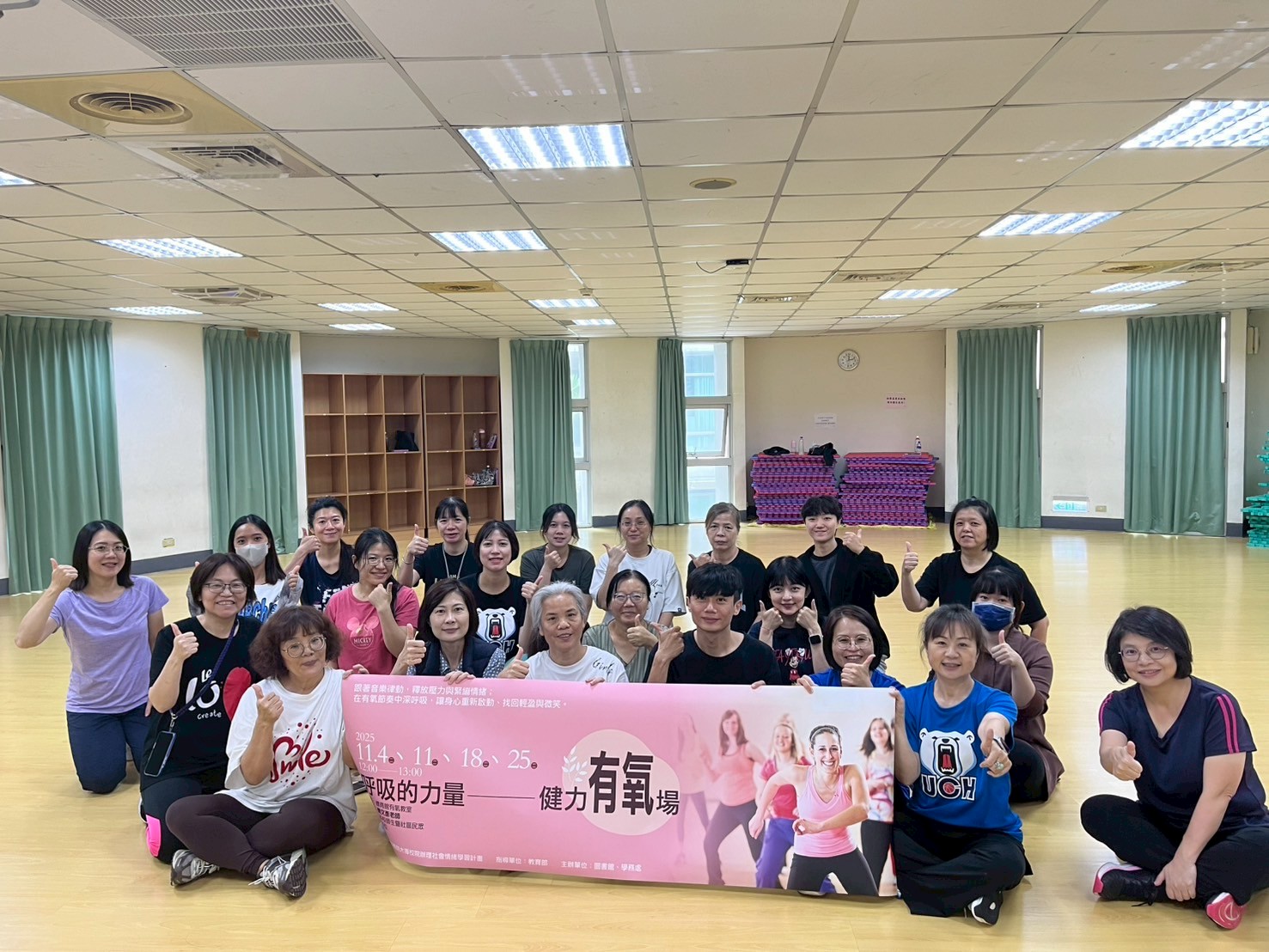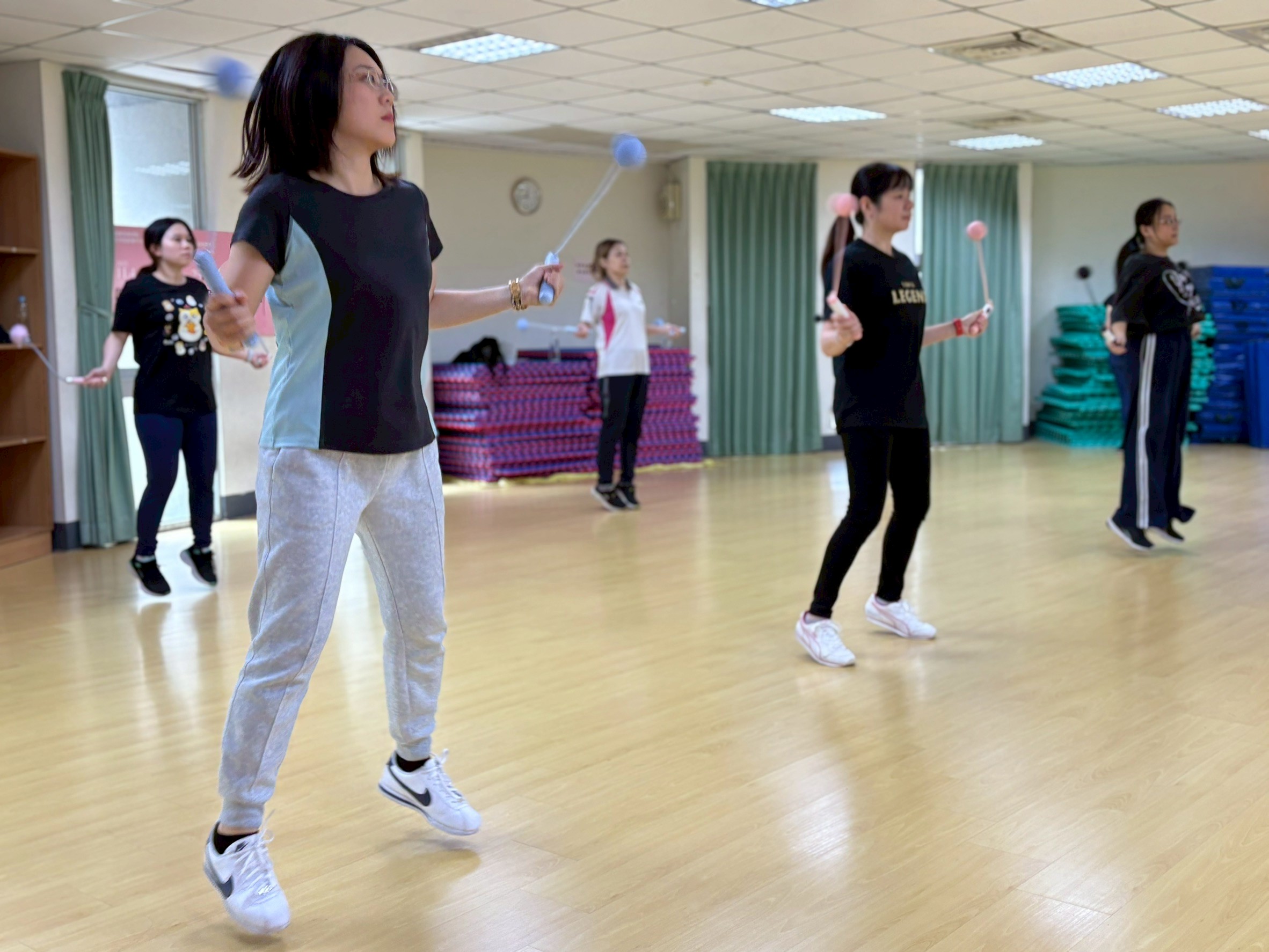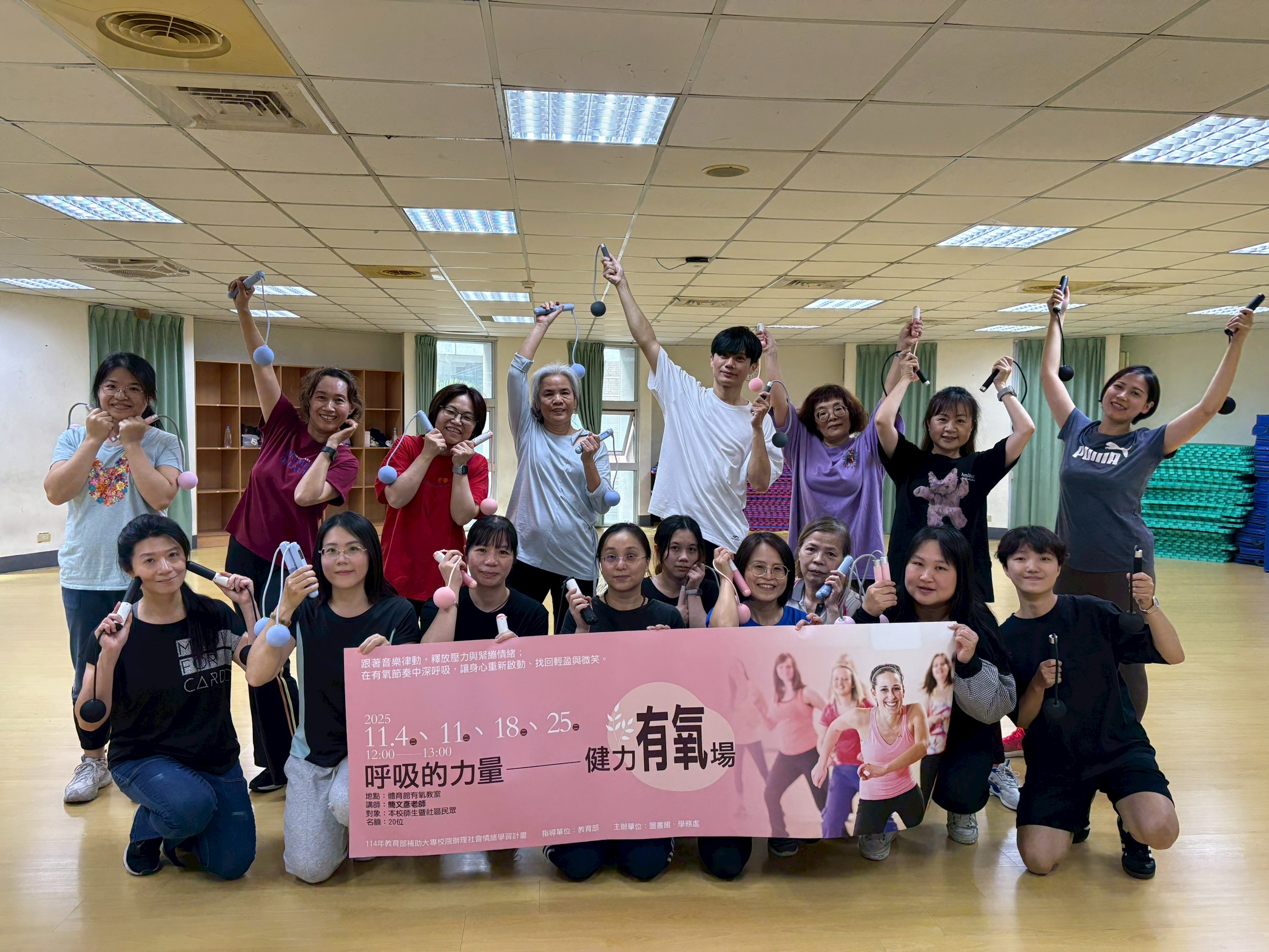 於114年11月4日、18日、25日、27日舉行,共計100人次參與。分別利用了:滑行盤、啞鈴、負重跳繩等讓學員體驗有器材輔助對身體的助益,利用節奏的掌握加上器材讓有氧增添更多的趣味。