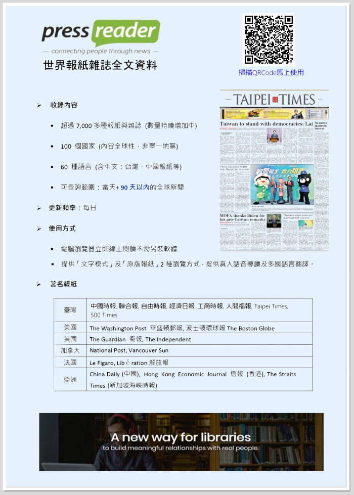 新訂電子資源: PressReader世界報紙雜誌資料庫